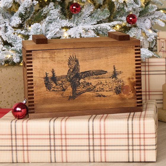 These attractive boxes are made of high quality solid native pine and features rugged hardware and finger-joint construction. Ideal for storing ammunition and hunting accessories or anything that you want stored in a handsome box. Features handles on both sides for easy carrying. Measures about 16"l x 8 1/4"d x 10 1/2"h. Made in the USA.