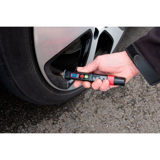 The unique design of our Brake Fluid & Tire Pressure Gauge accurately tests tire pressure and tests the quality of brake fluid. One end of the Gauge features a Digital Tire Pressure Gauge that displays the tire pressure on an easy-to-read backlit LCD screen. Flip the unit around to check the quality of Brake Fluid, providing the percentage of water in the braking system. Simply remove the end cap to expose two brake fluid detection probes and dip the probes into the sample brake fluid. Accurately tests DOT 3, DOT 4, and DOT 5.1 brake fluid. Tire pressure ranges from 3-150 psi. Measures about 6 1/2" x 1" x 1".• Accurately test DOT 3, DOT 4, and DOT 5.1 brake fluid