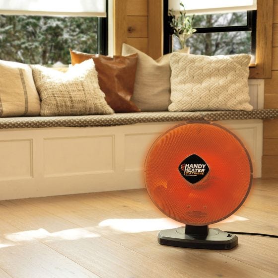 The Handy Heater Heatwave’s parabolic design directs radiant warmth toward you, not the air, for fast, quiet comfort. With two heat settings and large 15" radiant dish that oscillates 60° to heat the whole room. It’s perfect for bedrooms, offices, workshops and more. Features tip-over/overheat protection. 1200 watts, ETL listed.