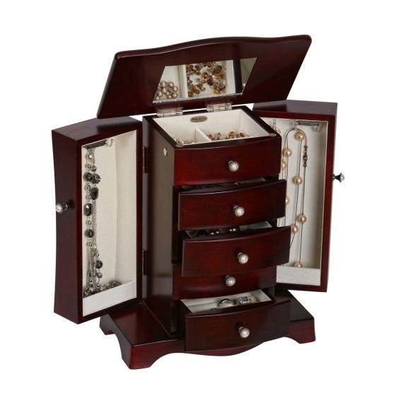 With its upright shapely hourglass silhouette and smart mahogany finish, the Rivercrest Women’s jewelry box is an exquisite cache for the most treasured pieces. This jewelry and accessory organizer is meticulously made and handcrafted with the dazzling jewelry wearer in mind. It’s easy to arrange your jewelry in style with this unique organizer. Lift the scalloped lid to find a trim interior mirror and four deep-set equally sized sections offering free form storage. Use the mirror to ensure you look your best in your sparkling jewels. The dual necklace doors harbor three hooks each plus catch panels to keep chains and beads neatly sorted and free of tangles. The four drawers feature three offering open area storage and one full ring roll drawer to hold a host of cocktail rings. Place earrings, bracelets, necklaces and more in these sections. Lustrous pearled drawer pulls, sumptuous hand lined ivory suede lining, and scallop-footed platform base furnish the final touches to this lovely jewelry chest. Effortlessly store this divine jewelry box on top of a dresser or table or neatly tuck it away for safekeeping. Wherever you place it, this unique organizer will make you want to add to your jewelry collection. Measures 10 1/4”l x 5 1/2”w x 11 1/2”h.