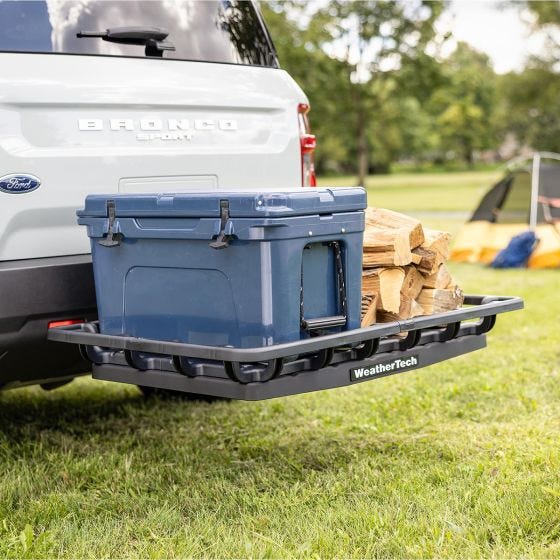 When indoor space won’t cut it and your roof rack isn’t right either, handle bulky gear like firewood, mulch, coolers or lawn equipment the straightforward way, with the heavy-duty hitch-mounted cargo carrier from WeatherTech. The Hitch Basket turns any standard 2-inch receiver into a hauling powerhouse and the impact-resistant plastic frame won’t rust, chip or corrode, unlike metal options, backed by a 100% aluminum frame designed for durability. Reinforced aluminum support structure is intentionally engineered to handle a 500 lb. weight capacity. Hitch bolt included. Please allow two weeks for delivery. Weighs 27 lbs. Measures about 45″ x 28 ½″. Made in the USA.